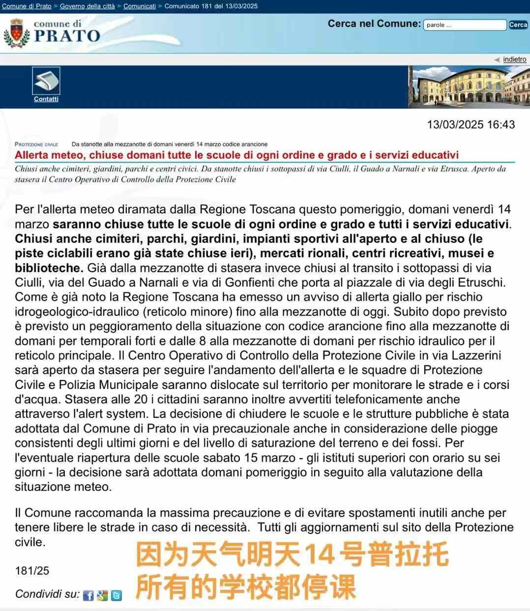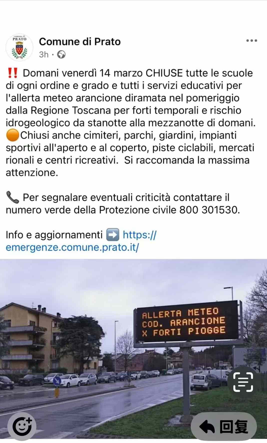 天气预警:因恶劣天气,普拉托市明日(3月14日)所有学校停课,公园、市场等场所关闭