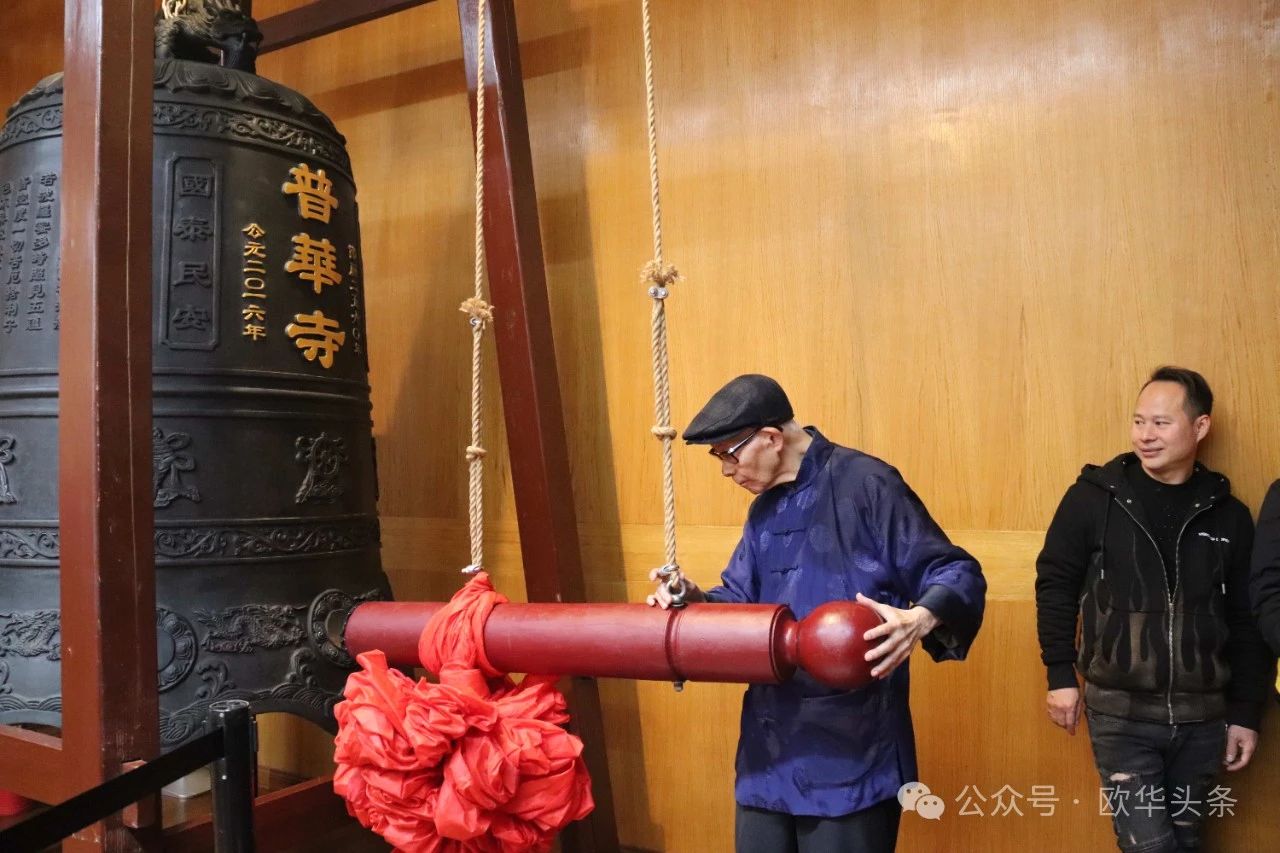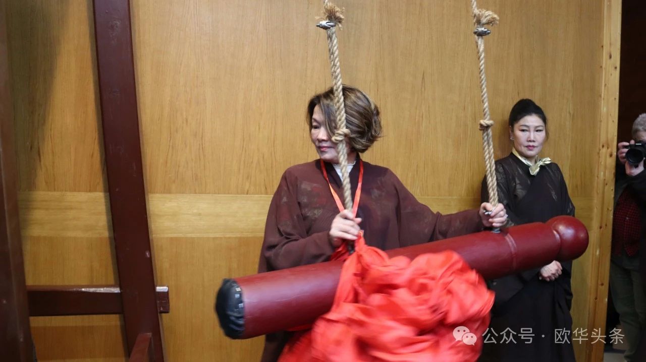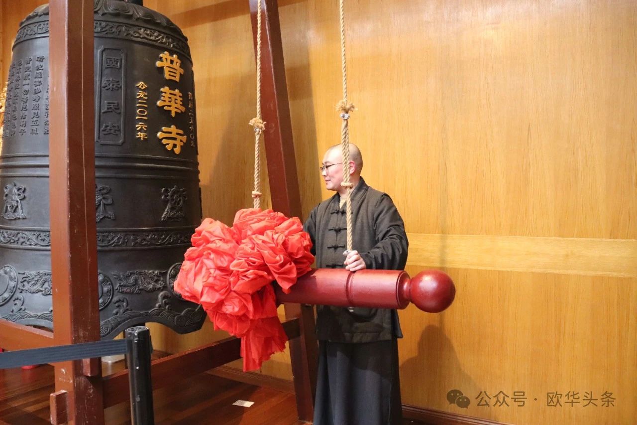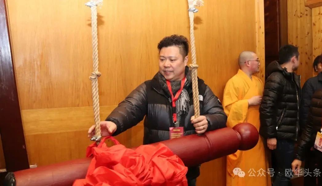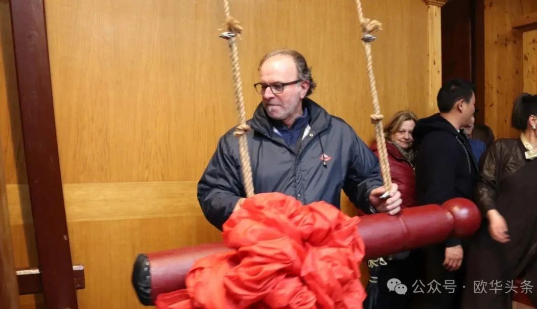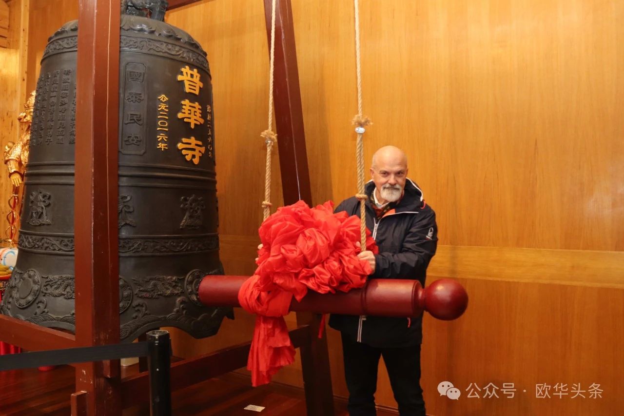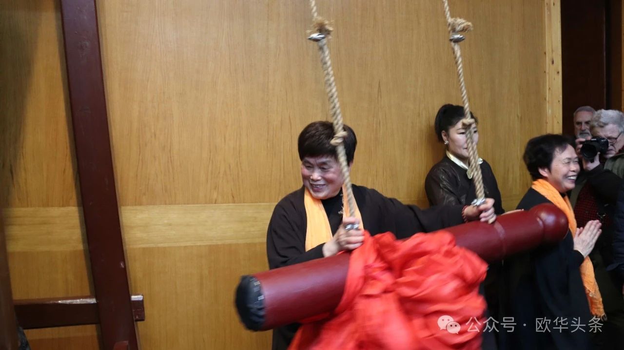 敲钟仪式上,庄严肃穆的氛围洋溢在整个场地,祈求大家在新的一年里平安健康、幸福快乐。在意大利华侨华人佛教总会会长黄树林敲响新年第一钟后,参与者们依次上前,用木槌敲击大钟,象征着敲响幸福、健康、吉祥的钟声,祈愿新的一年万事如意、平安顺利。每一声钟响都伴随着参与者们的祈愿与祝福,感受到浓浓的节日氛围和中华传统文化的底蕴。