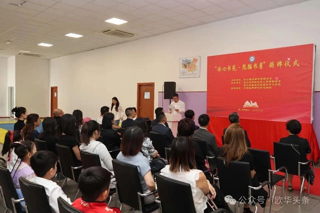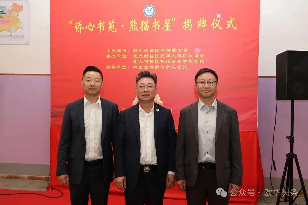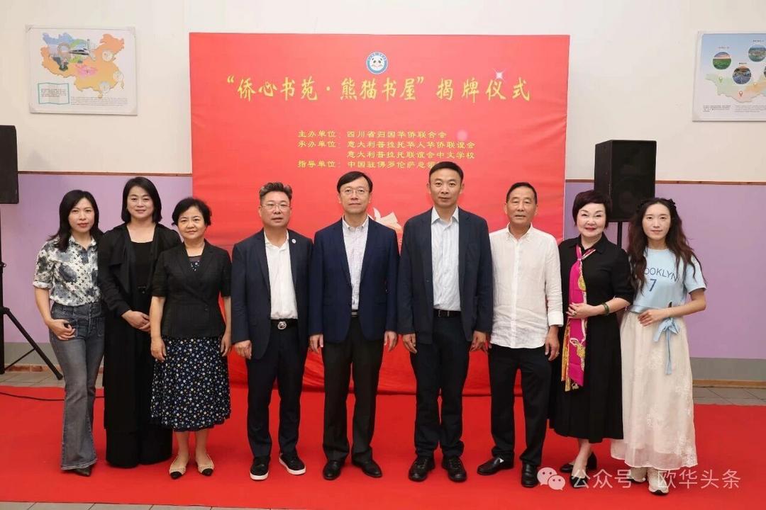四川省侨联黄灏副主席、四川省外办二级巡视员罗蓉,中国驻佛罗伦萨总领馆管仲奇代总领事、周莅淼主任,以及普拉托华人华侨联谊会会长黄晓龙、名誉会长郑贤杰共同为“侨心书苑·熊猫书屋”揭牌。揭牌仪式不仅为中文学校带来了一份厚礼,更为普拉托华文教育注入了新的活力与信心。