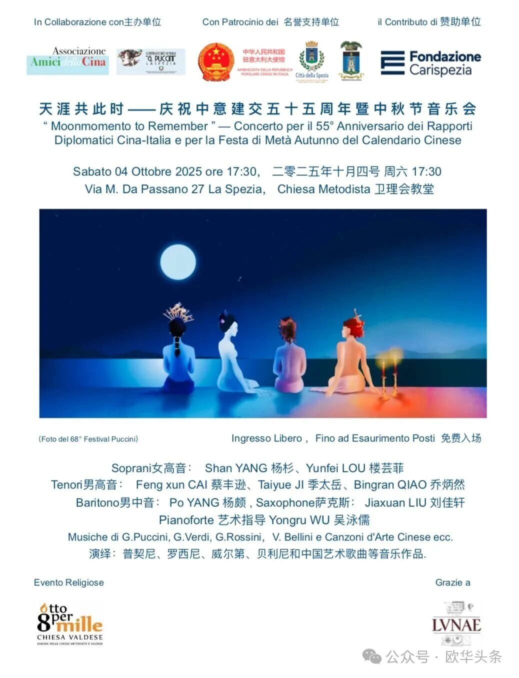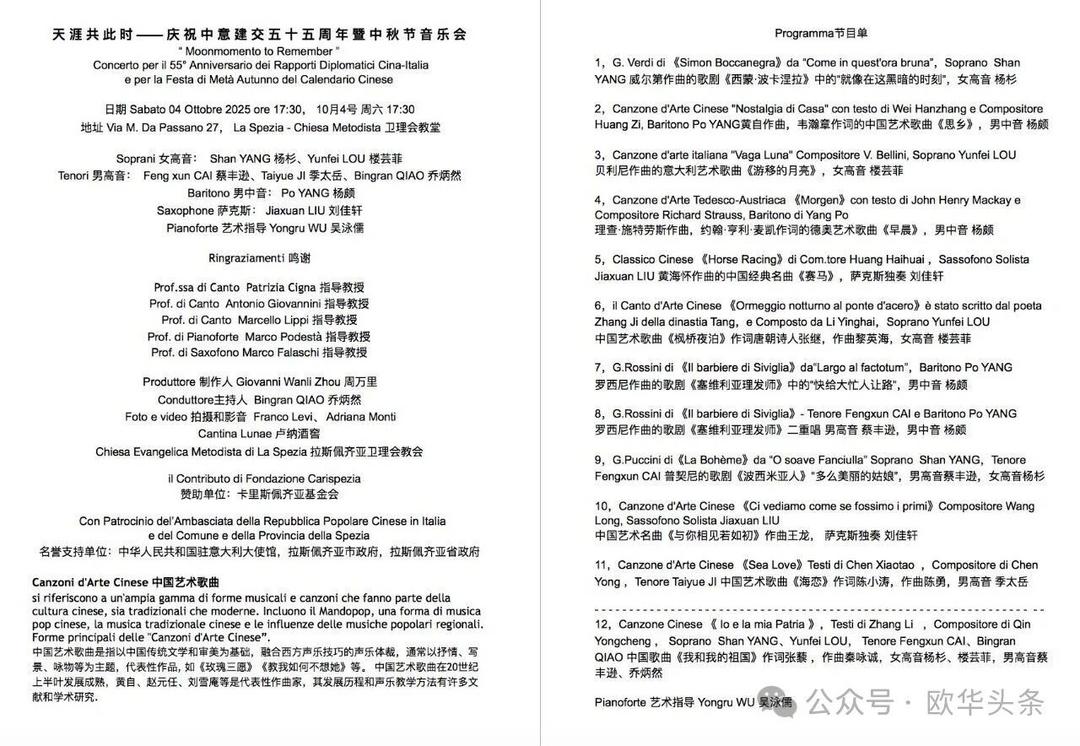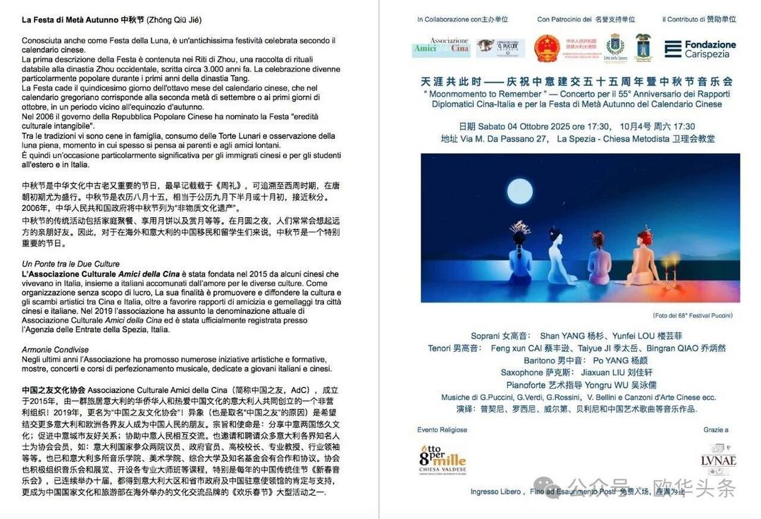 (欧华头条 陈静)2025年10月4日下午17时30分,《天涯共此时——庆祝中意建交五十五周年暨中秋节音乐会》在意大利拉斯佩齐亚卫理会堂成功举办。