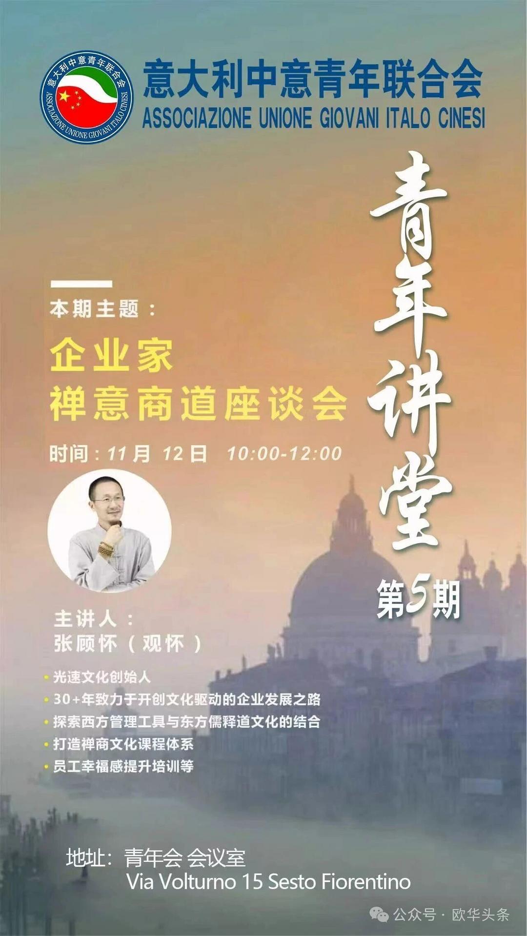 (欧华头条 陈静)2025年11月12日,由意大利中意青年联合会主办的“企业家禅意商道讲坛”在本会所温馨举行。活动以“让心回归·让业有道”为主题,为在意华人企业家与青年群体带来一场别开生面的精神盛宴。