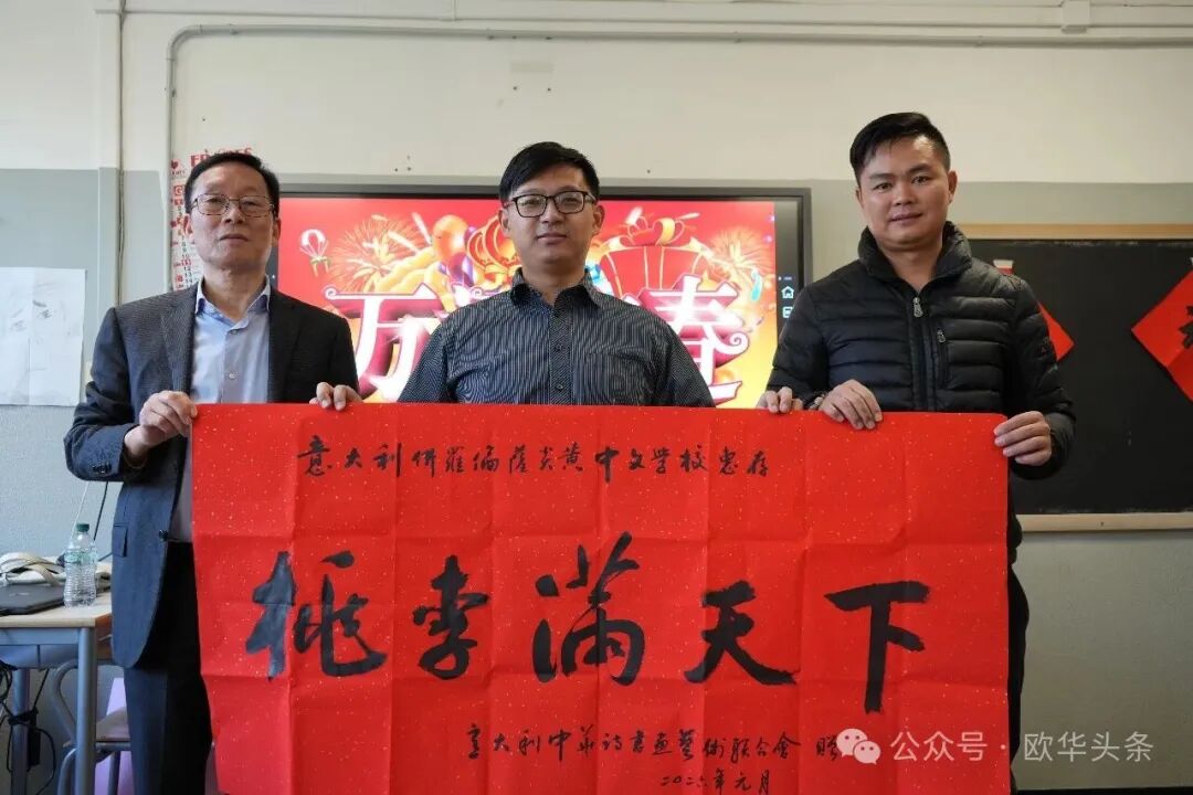 书法活动现场,意大利中华诗书画艺术联合会会长周建煌还向炎黄中文学校赠送了书法作品“桃李满天下”,以此表达对学校长期深耕中文教育、培育海外中文人才的肯定与祝福,现场掌声热烈。