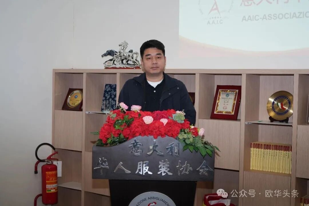 ▲会议伊始,第三届会长李小锋发表讲话。他回顾了协会成立11年来的发展历程,向全体会员及历届理事会成员致以诚挚感谢,感谢大家长期以来对他本人及三届理事会工作的支持与信任。李小锋会长表示,协会始终秉持“平等、分享、上进、公益”的宗旨,在服务行业、回馈社会方面做了大量扎实工作。他特别提到,协会成立之初开展调研,吸引理事单位加入,并积极加强普拉托IOLO、TAVOLA 工业区的安保工作,为当年普拉托地区治安稳定作出了实际贡献,切实守护了一方平安。此外,在疫情期间,协会成员守望相助、共克时艰,充分展现了华人服装行业的凝聚力与责任感。