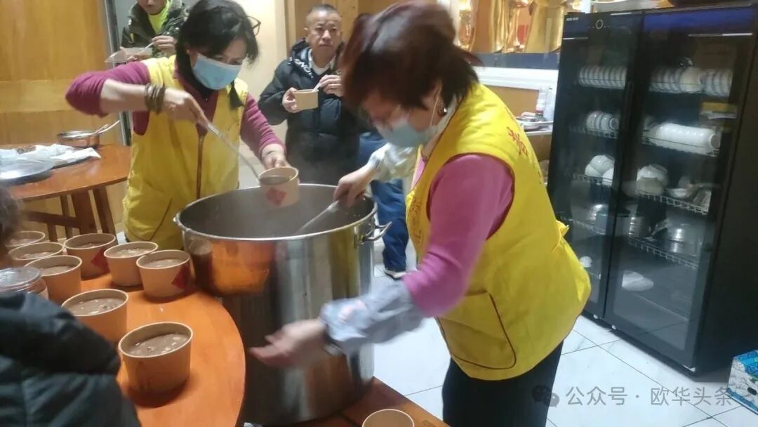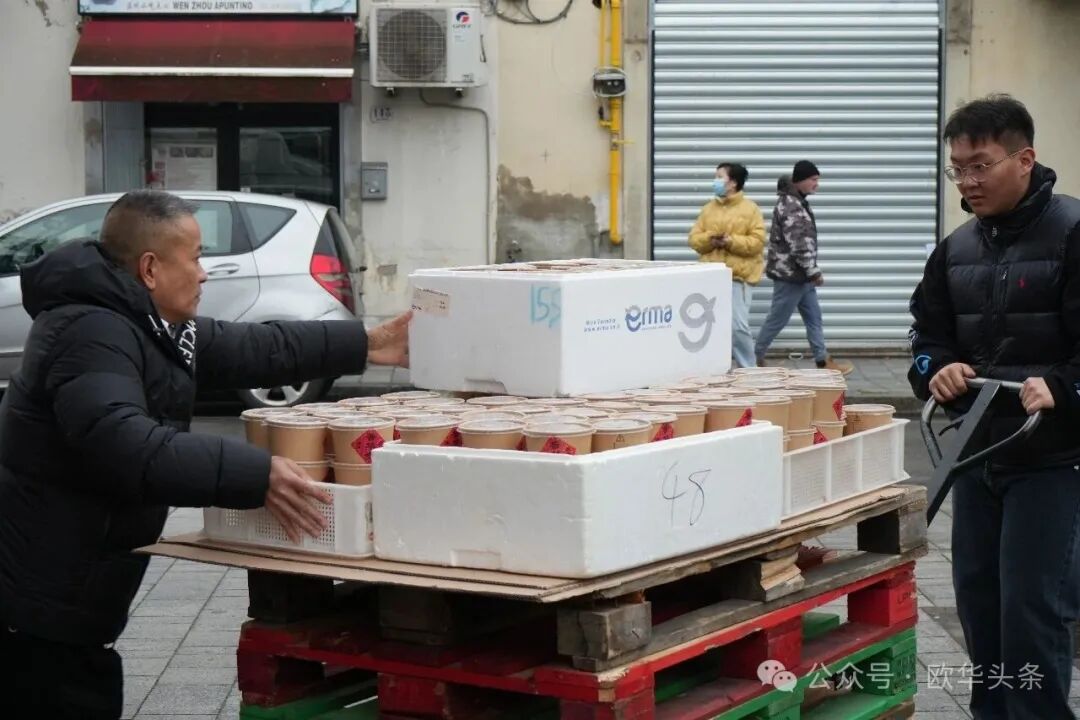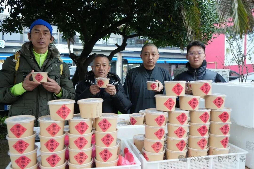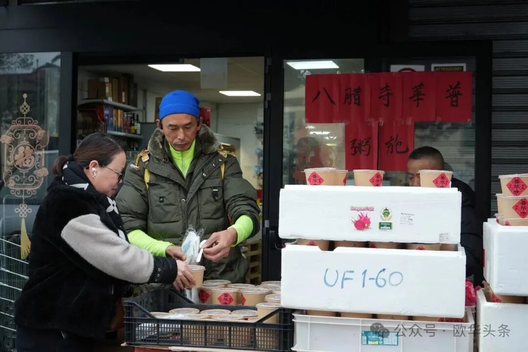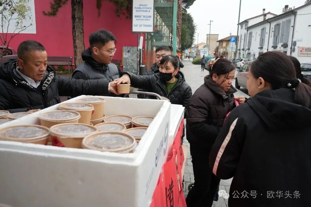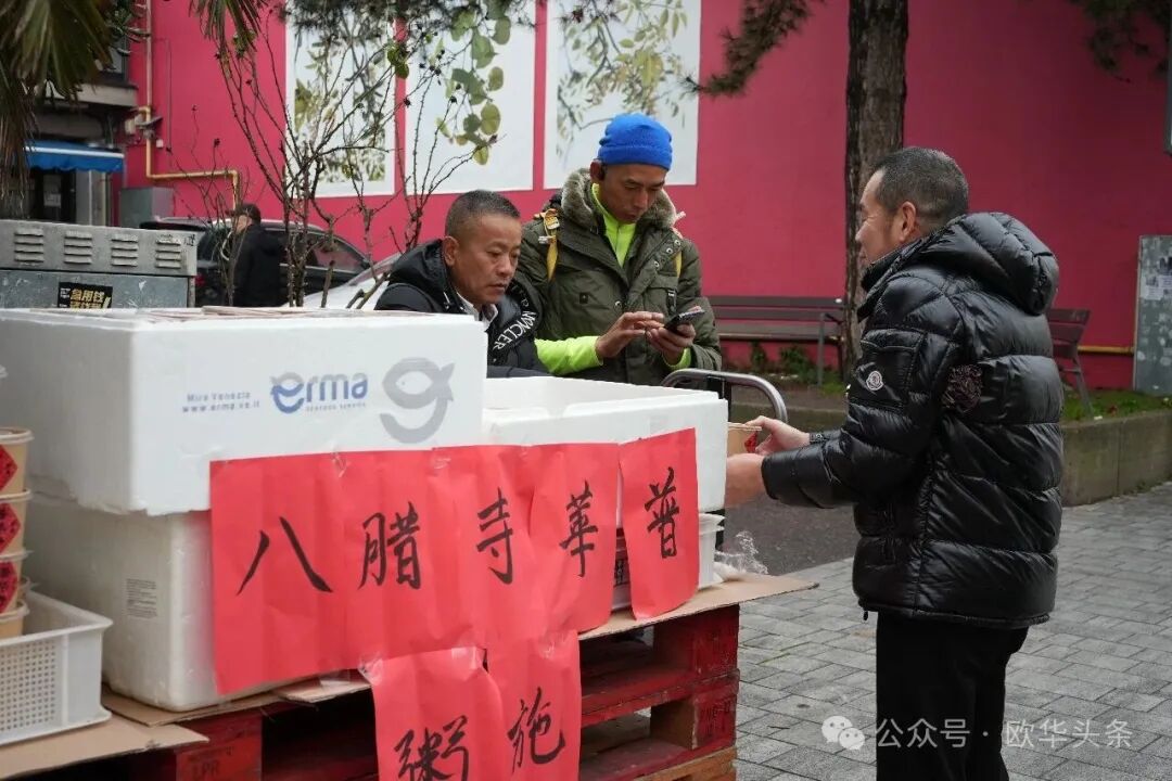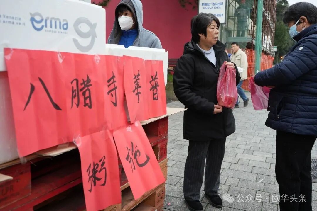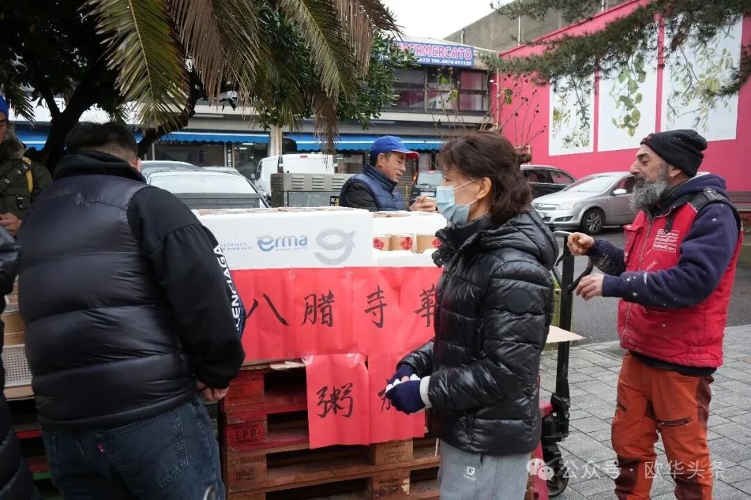 当日上午,普华寺除在寺内向善信免费发放腊八粥外,还组织义工团队走进普拉托华人街、IOLO及TAVOLA工业区,向当地侨民及意大利居民分发约3000份腊八粥。粥香四溢,人情温暖,不少华侨华人及当地民众陆续前来领取,现场秩序井然、气氛祥和,充分展现了佛教“慈悲济世、利乐有情”的精神,也成为寒冬中一道温暖人心的风景线。