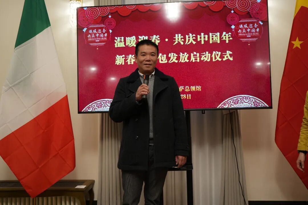 ▲意大利普拉托华人华侨联谊会会长陈洲在致辞中表示,新春暖心包不仅是一份节日祝福,更是一份沉甸甸的关爱与牵挂,体现了祖国始终心系海外侨胞的深厚情谊。他表示,普拉托侨界将一如既往支持和配合总领馆工作,团结广大侨胞,积极融入当地社会,为促进中意民间友好交流、建设和谐侨社继续作出积极贡献。