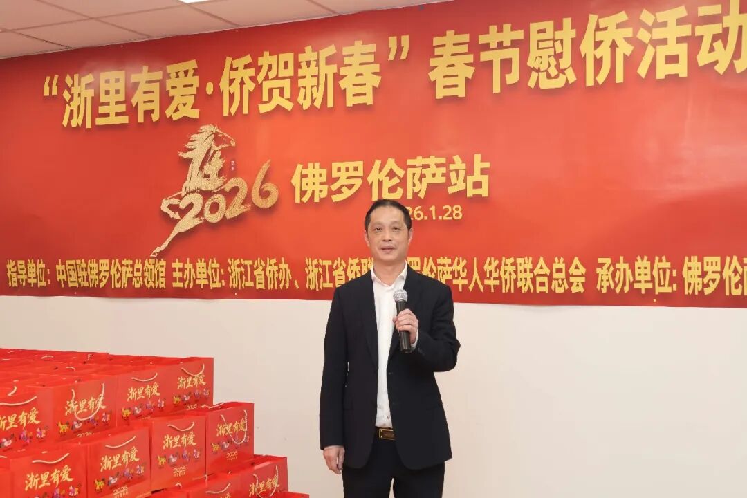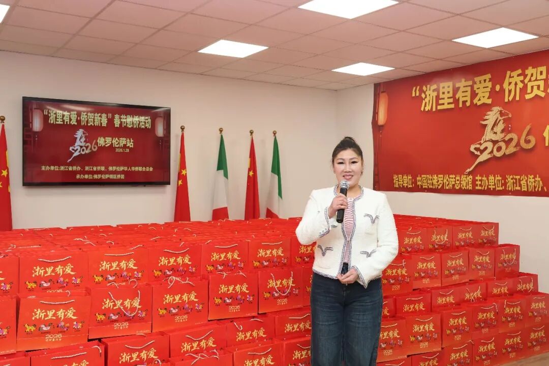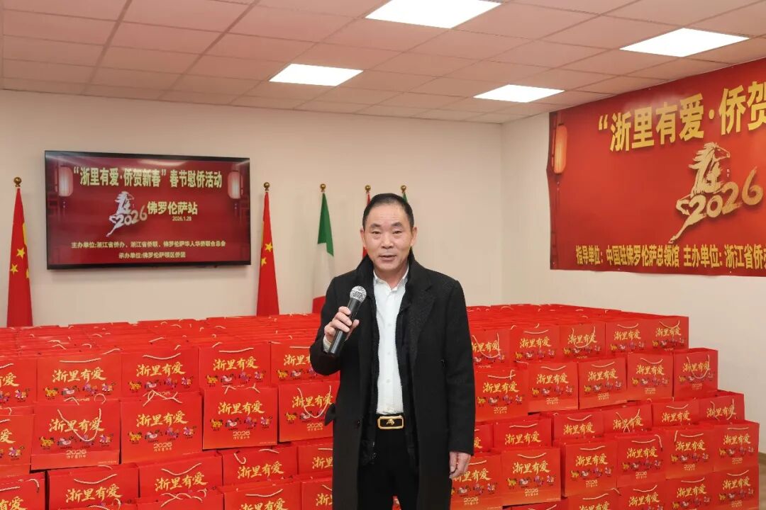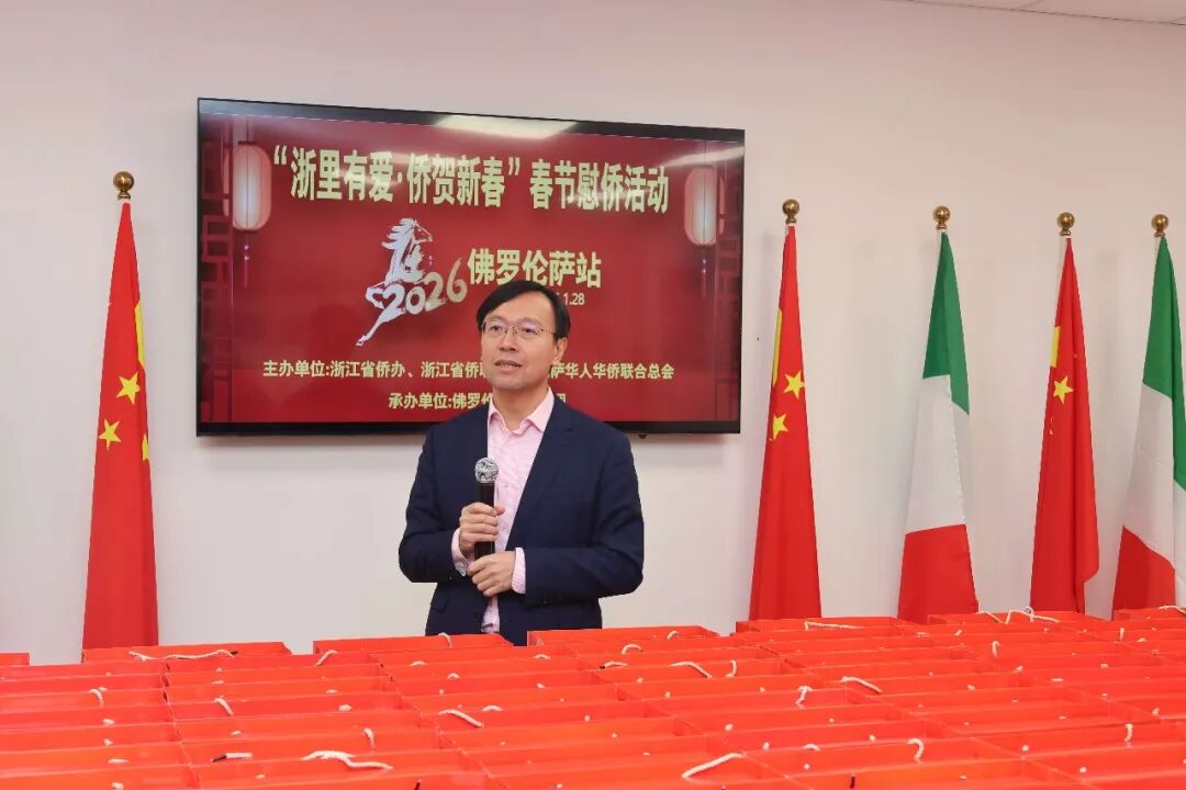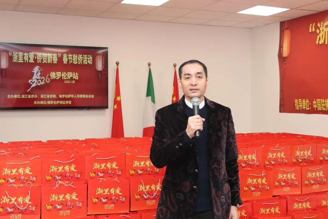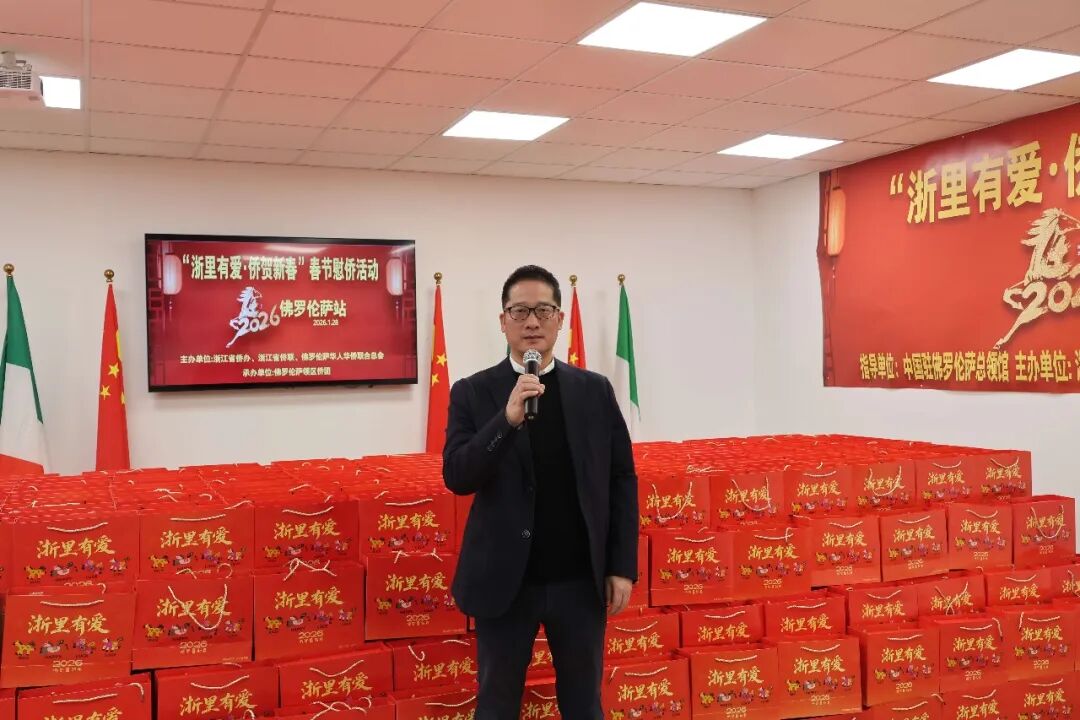 1月28日下午三时,2026年“浙里有爱·侨贺新春”春节慰侨活动佛罗伦萨站启动仪式在意大利佛罗伦萨隆重举行。此次活动在中国驻佛罗伦萨总领馆的指导下,由浙江省侨办、浙江省侨联和意大利佛罗伦萨华人华侨联合总会共同主办,佛罗伦萨领区各侨团联合承办,面向佛罗伦萨领区广大侨胞、留学生代表发放新春暖心包,把来自祖国的关怀与祝福送到海外侨胞身边。