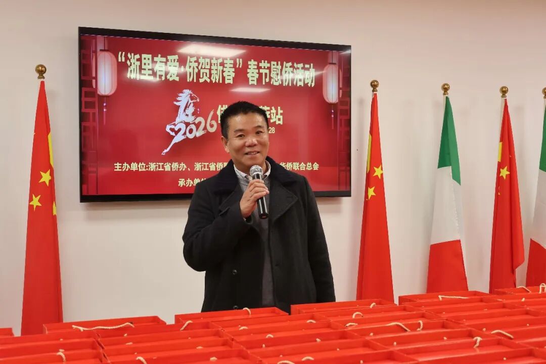 意大利普拉托华人华侨联谊会会长陈洲在致辞中代表联谊会,向浙江省侨办、浙江省侨联长期以来对海外侨胞的关心关爱表示衷心感谢。他表示,“浙里有爱·侨贺新春”慰侨活动多年来持续开展,不仅传递了家乡对侨胞的深情厚谊,也让广大旅意侨胞在异国他乡深切感受到祖国的温暖与牵挂。值此2026年新春佳节即将到来之际,这份关怀显得尤为珍贵、意义深远。陈洲会长表示,普拉托华人华侨联谊会始终坚持团结服务侨胞,积极参与和支持领区各项公益事业与文化交流活动。今后将继续加强与兄弟侨团的交流协作,进一步凝聚侨心、汇聚侨力,为侨社和谐发展以及中意民间友好交流贡献力量。他致辞最后祝愿“浙里有爱·侨贺新春”春节慰侨活动圆满成功,并向与会领导和嘉宾致以新春的美好祝福。