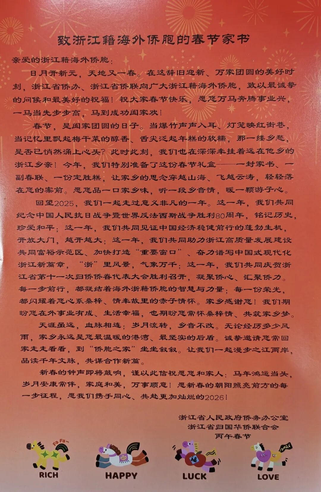 本次发放的春节暖心包内,除春联、灯笼、福字等节日用品外,还特别附上了一封饱含乡情的《致浙江籍海外侨胞的春节家书》。家书以真挚朴实的文字,向海外游子送上新春祝福,传递家乡的思念与牵挂,让广大侨胞在异国他乡感受到来自祖国和家乡的温暖。