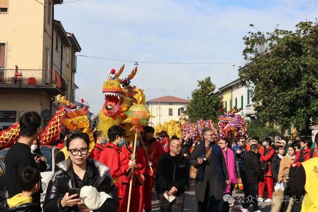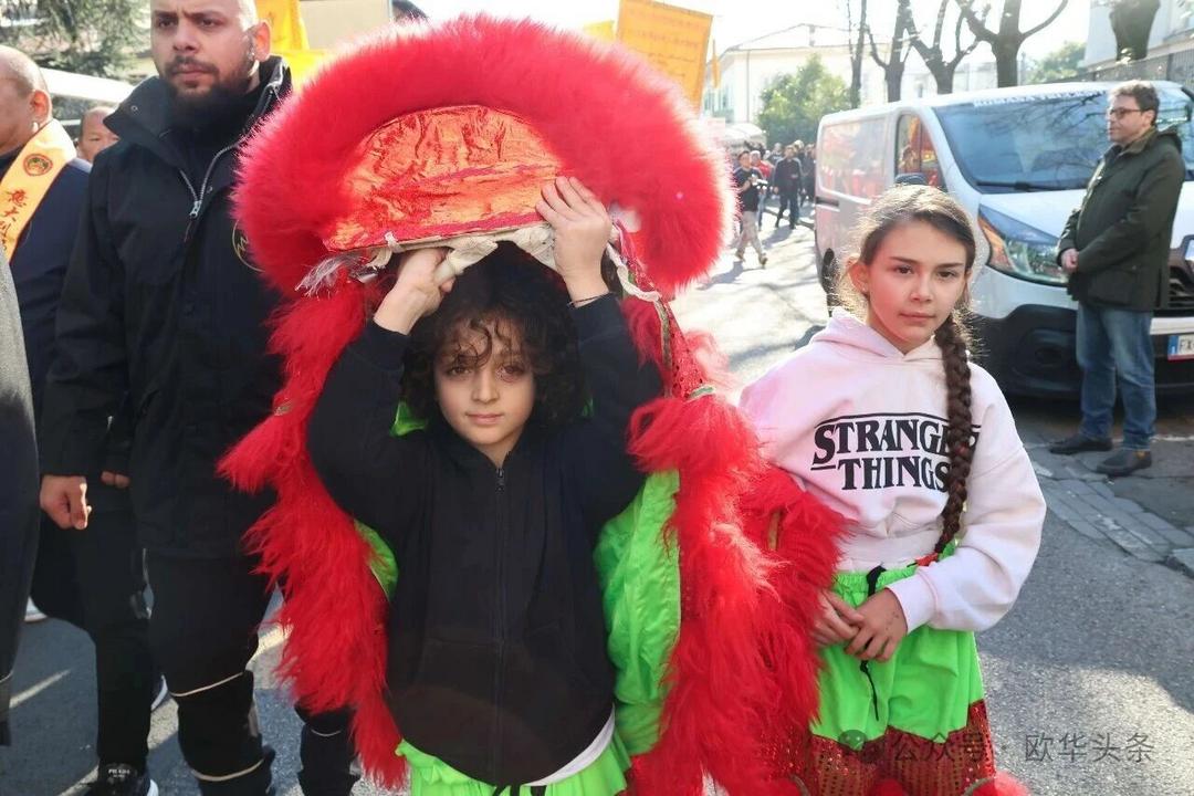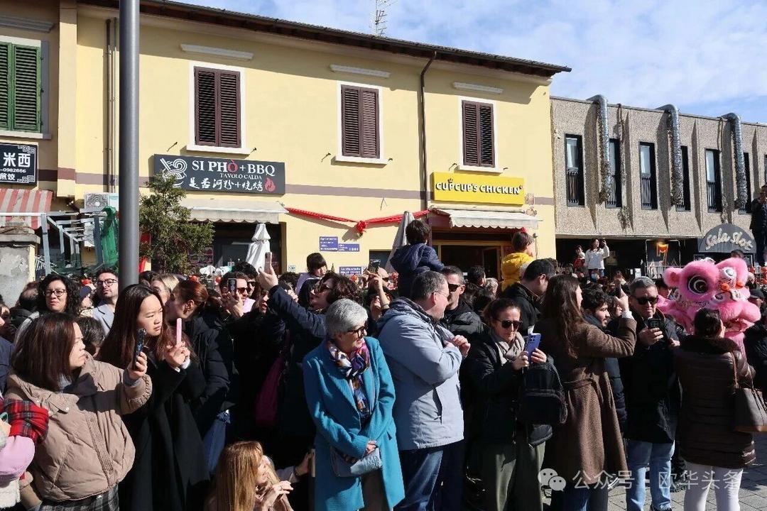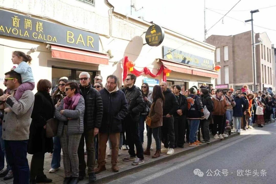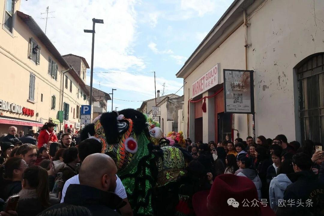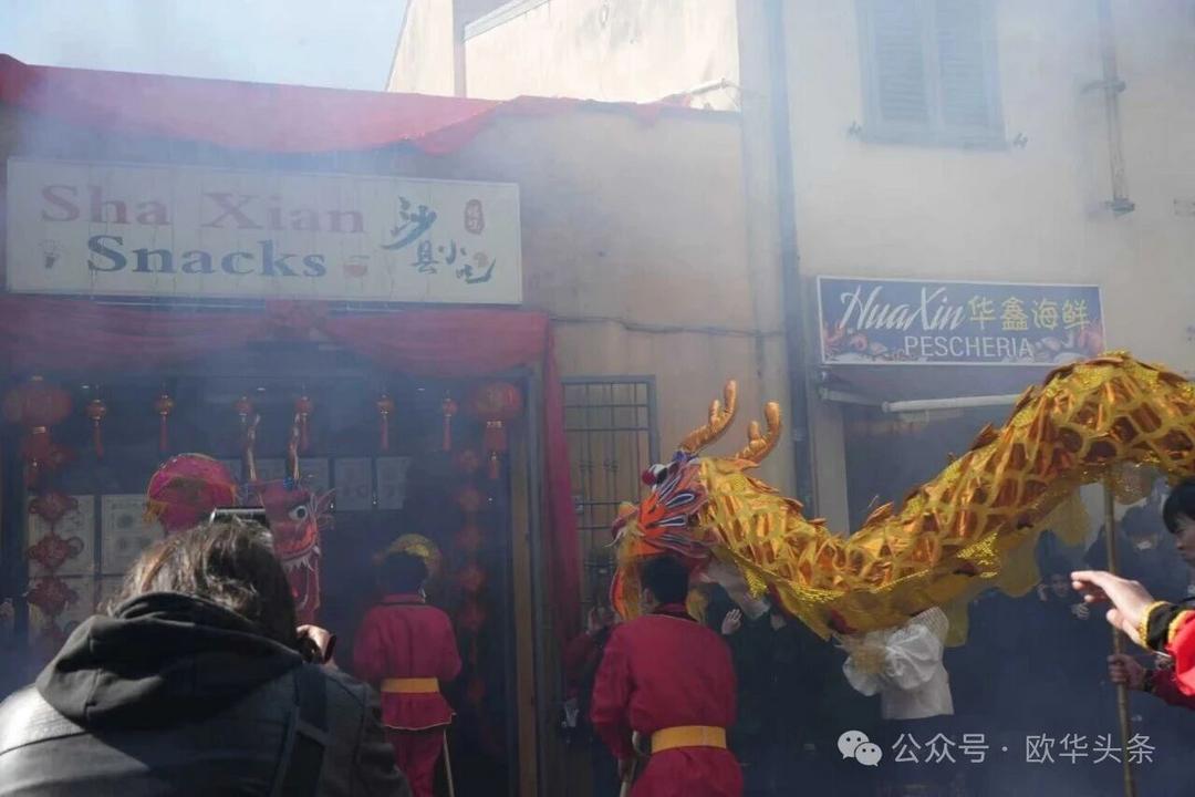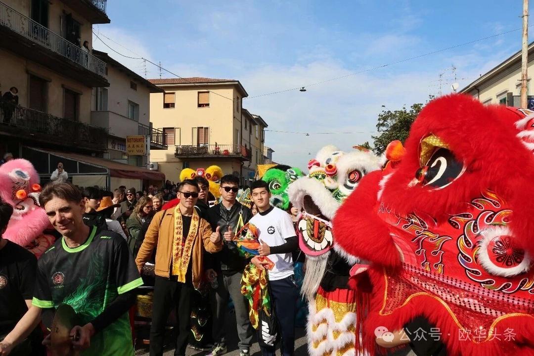 一路走来,沿途的商家纷纷加入庆祝行列,悬挂红灯笼、张贴福字,送出小礼物,向巡游队伍致意祝福。现场不仅有华人居民热情参与,当地意大利市民也被传统的龙狮文化深深吸引,大家掌声、喝彩声此起彼伏,将街区氛围推向高潮。