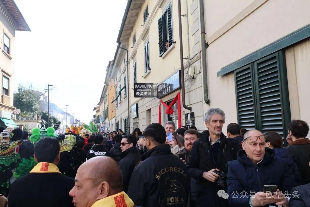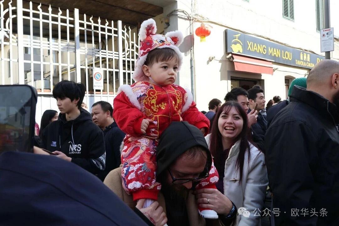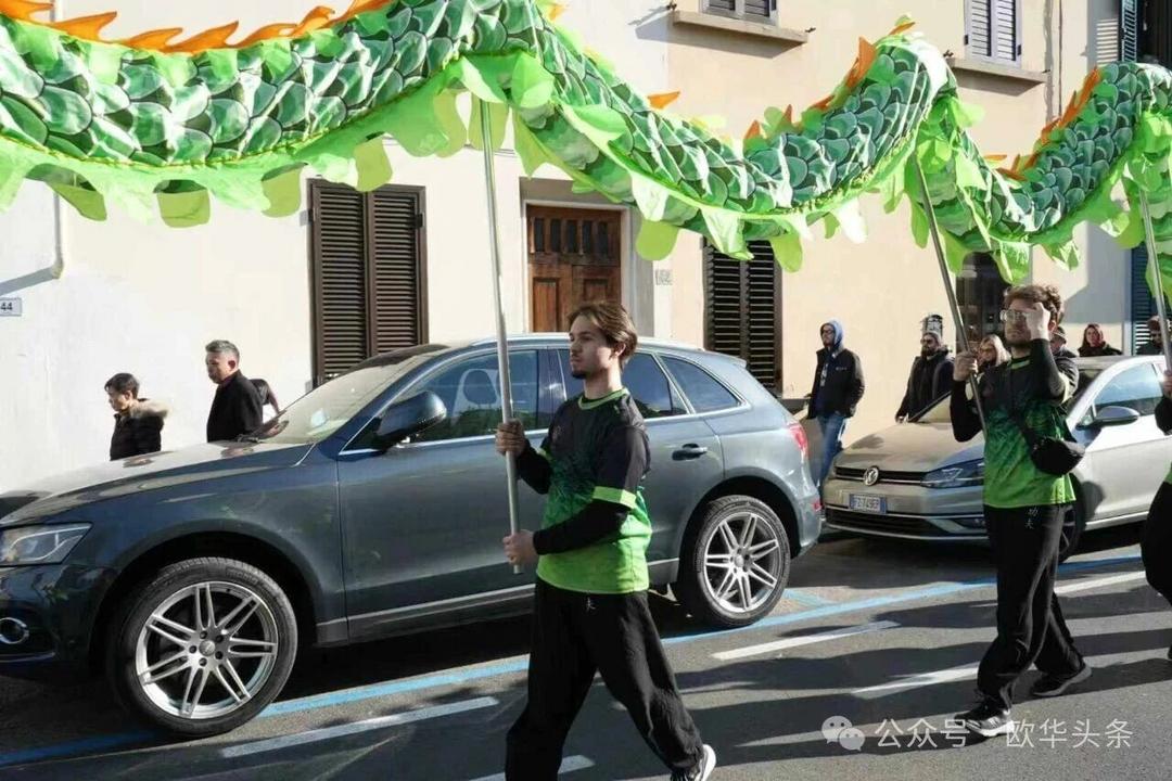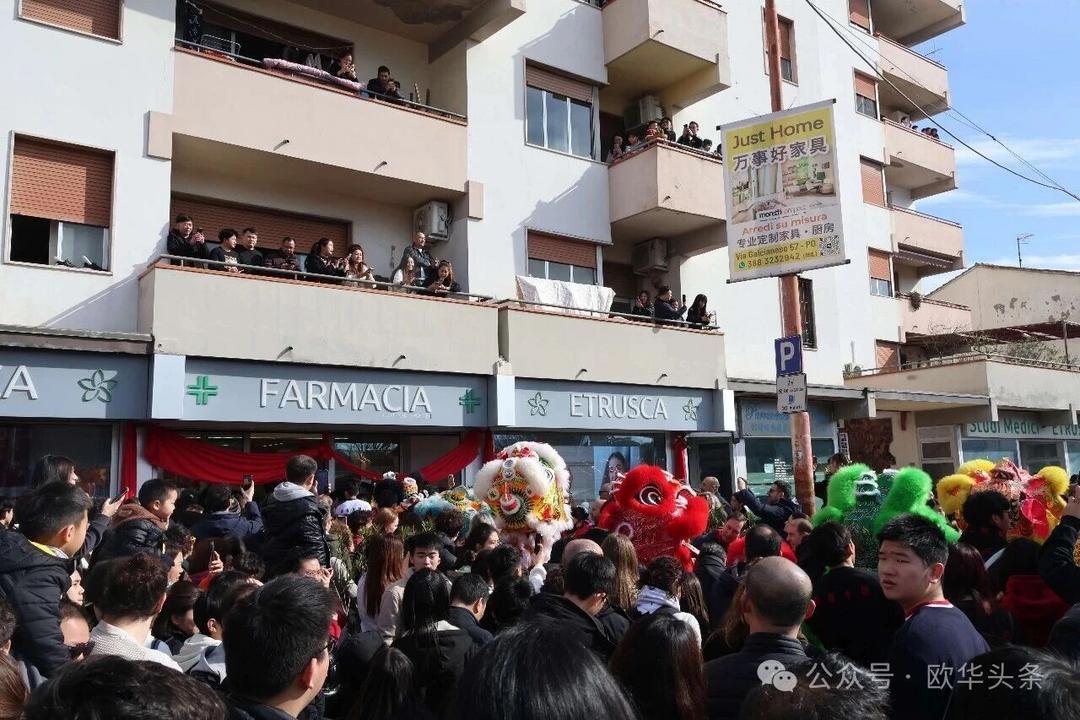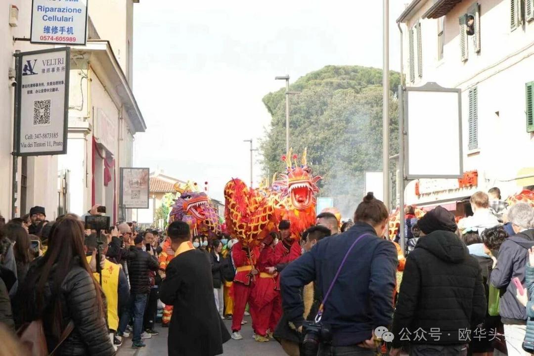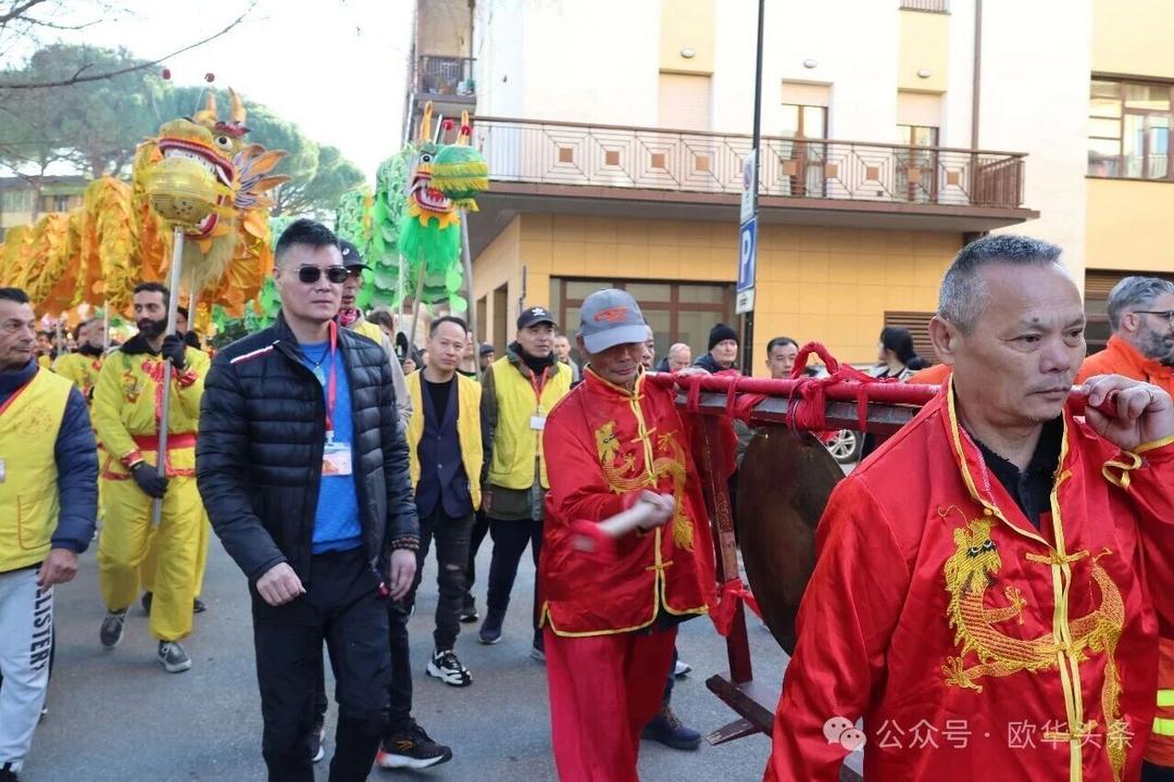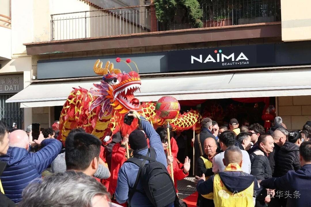 一路走来,沿途的商家纷纷加入庆祝行列,悬挂红灯笼、张贴福字,送出小礼物,向巡游队伍致意祝福。现场不仅有华人居民热情参与,当地意大利市民也被传统的龙狮文化深深吸引,大家掌声、喝彩声此起彼伏,将街区氛围推向高潮。