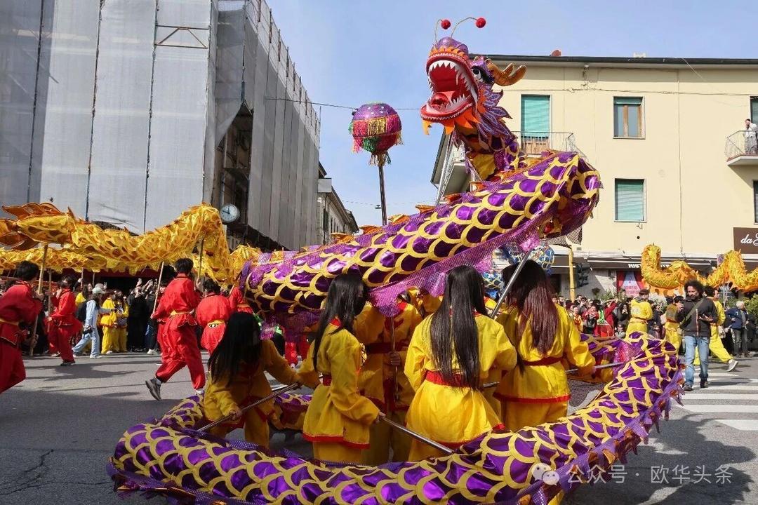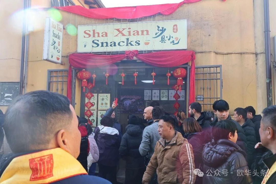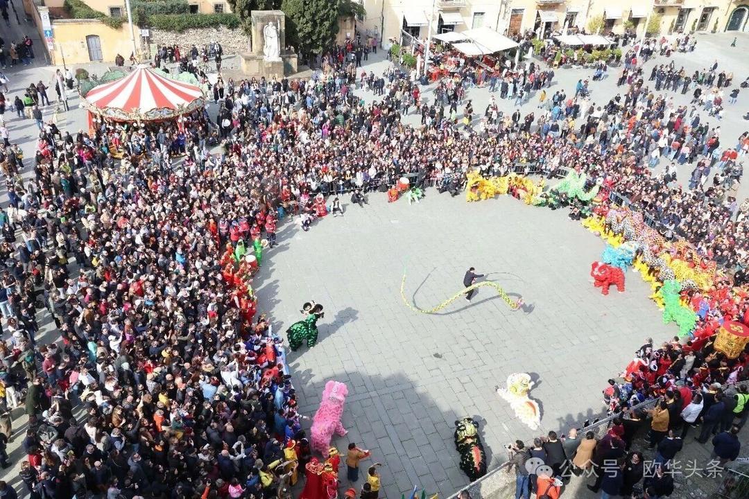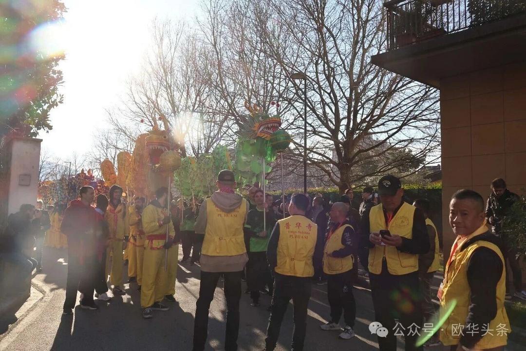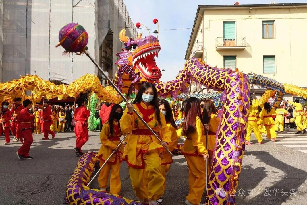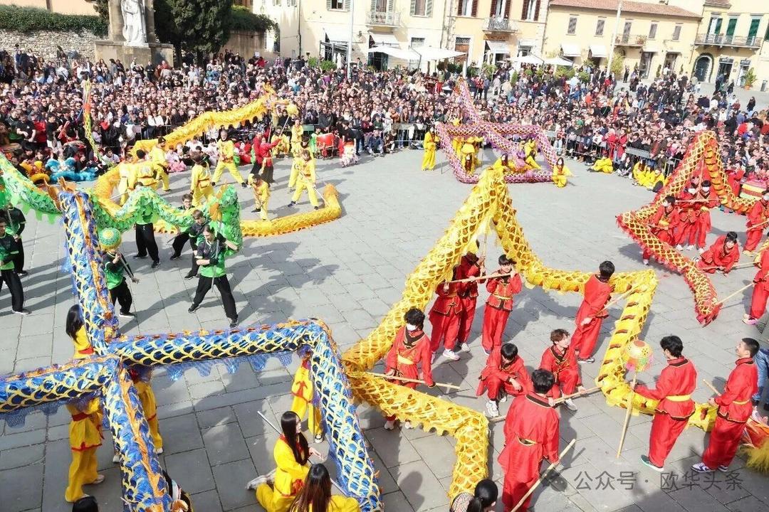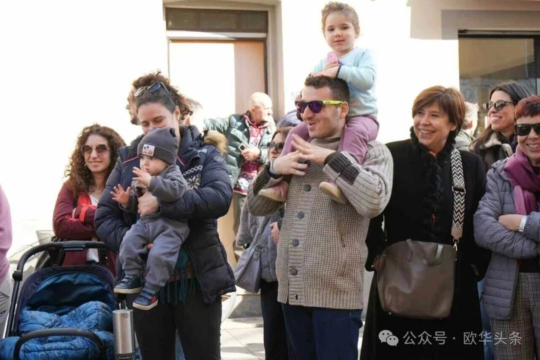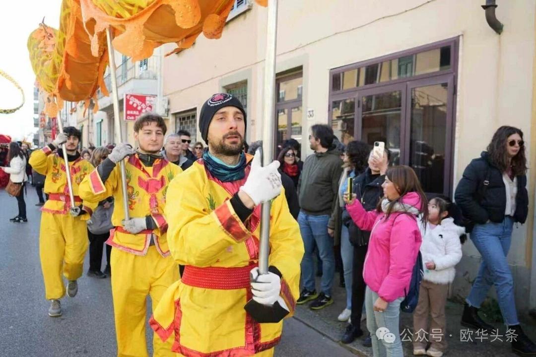 一路走来,沿途的商家纷纷加入庆祝行列,悬挂红灯笼、张贴福字,送出小礼物,向巡游队伍致意祝福。现场不仅有华人居民热情参与,当地意大利市民也被传统的龙狮文化深深吸引,大家掌声、喝彩声此起彼伏,将街区氛围推向高潮。
