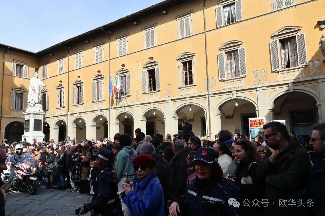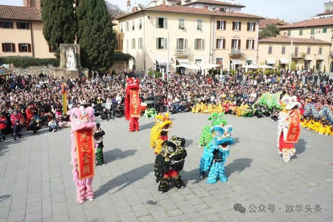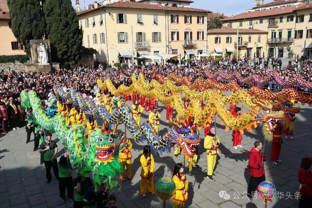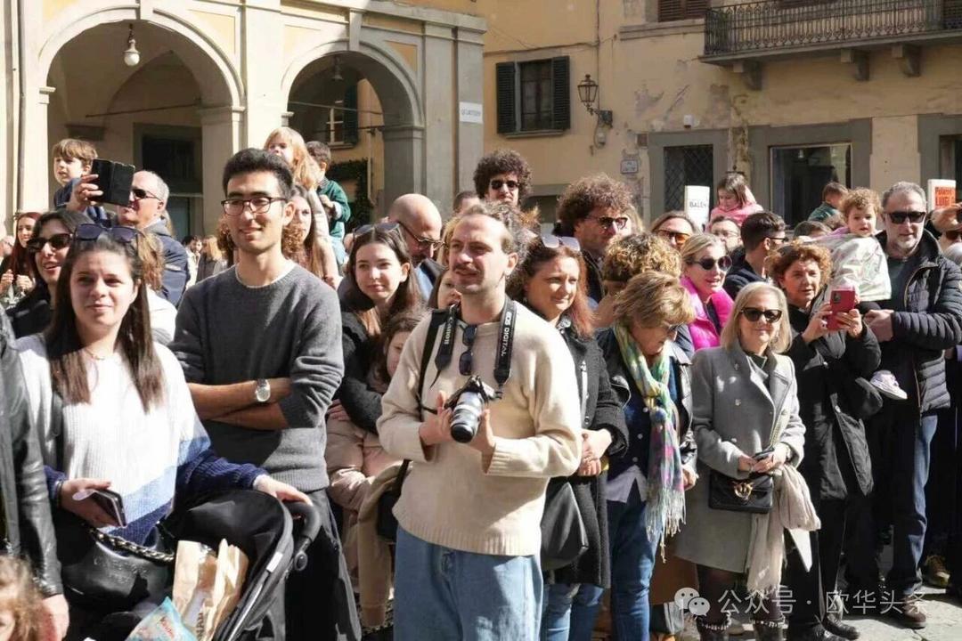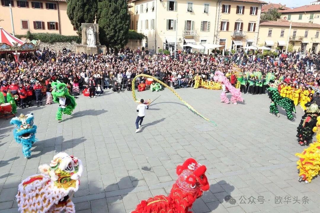 巡游队伍最终抵达普拉托市中心的城堡广场,进行闭幕表演。舞龙舞狮、锣鼓齐鸣,中意队员们技艺精湛、动作整齐,赢得了观众阵阵喝彩与掌声。闭幕仪式不仅展现了东方传统民俗的独特魅力,也让全城居民共同感受到新春的祥瑞与喜庆,现场奏响中意两国国歌将气氛推向高潮。
